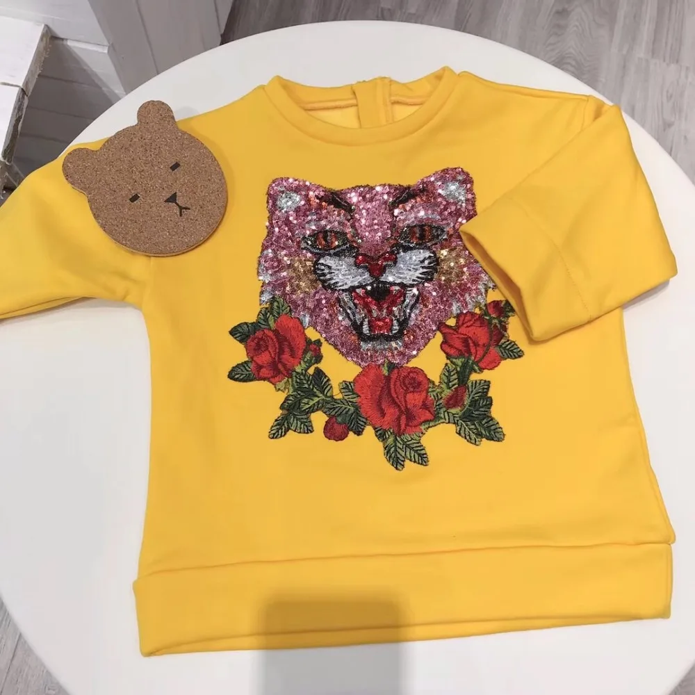 Детская модная одежда Gils, Осенние Топы нового дизайна, желтые топы с блестками и длинным рукавом, топы с вышивкой и цветочным рисунком кошки, одежда для девочек