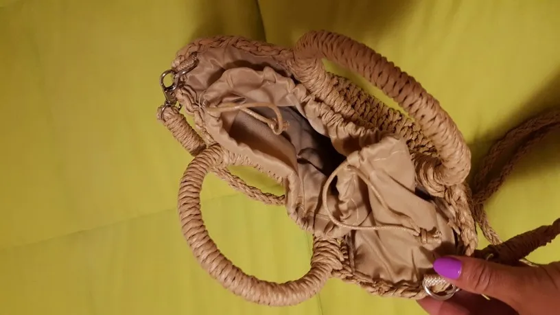 Хорошенькая маленькая аккуратная сумочка. Длинный ремень хорошей длинны, можно отстегнуть. Видимых недостатков не увидела. При желании можно закрыть сумку затянув веревочки. Единственный минус долгая доставка, почти месяц. Но мне было не к спеху, так что не принципиально. Продавец положил в подарок резиночку))