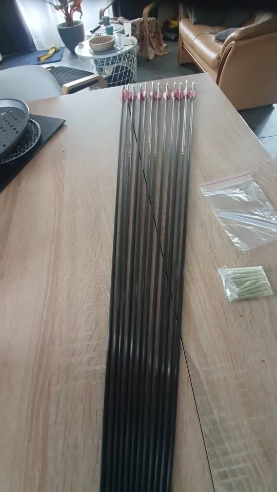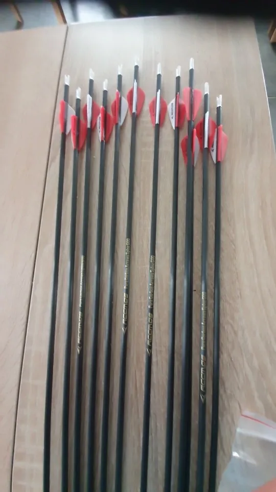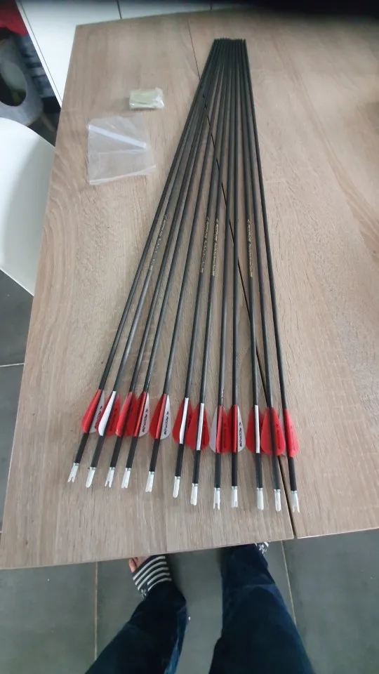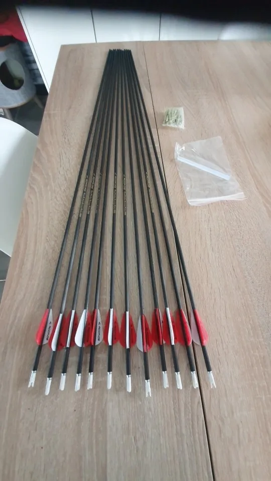Попросил обрезать стрелы до 30" и другой цвет перьев. Срелы обрезали, но про оперение забыли. Сами стрелы по виду очень даже ничего. Выглядят более солидно, чем такой же Acmos из другого магазина. В наборе прислали 13 наконечник по 70 гр и налочка термоклея. Упаковано хорошо. Доставка около месяца. Продавец общительный