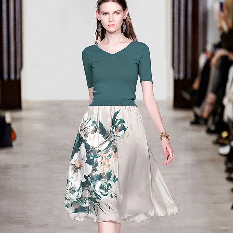Женский комплект с юбкой, трикотажная рубашка с коротким рукавом, V-образным вырезом и цветочным принтом, трапециевидный силуэт, Офисная Женская юбка