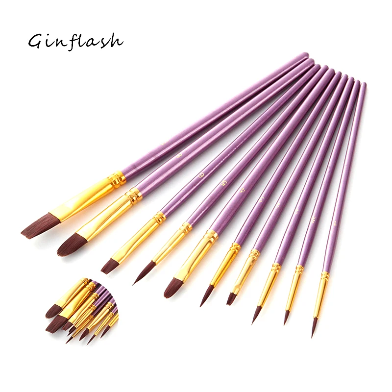 Кисти для рисования акварелью и гуашью, 10шт.пакет, разной формы, с круглыми и заостренными кончиками, нейлоновые, комплект, принадлежности для живописи, без коробки