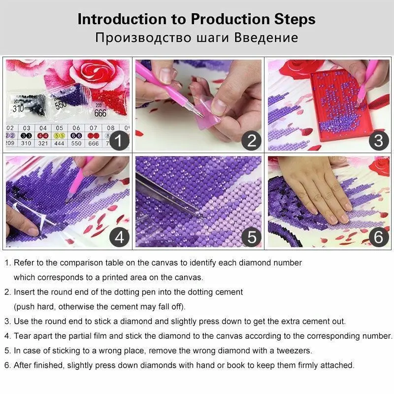 1. Откройте коробку и проверьте алмазные инструменты. 2. Посмотрите цвет алмазов из смолы, упорядоченный в порядке кодирования. 3. Вставьте круглый конец ручки в дозировочный цемент (нажмите жесткий, в противном случае цемент может упасть). 4. Разорвите частичную пленку и приклейте бриллиант к холсту в соответствии с соответствующим номером 5. В соответствии с соответствующим цветовым кодом зажим соответствующие смолы инкрустированные алмазы. Используйте круглый конец, чтобы приклеить алмаз и слегка нажмите вниз, чтобы получить дополнительный цемент. 6. Чехол не в том месте, удалите не тот алмаз 7. Предположили, что один тип алмаза из смолы завершился быстрее. 8. Для того, чтобы создать идеальную алмазную картину, рисунки помещаются в одном месте каждый ряд символов не должны оставаться застрявшими алмазами. 9. Чтобы разрезать хорошую фигуру на чертежах, удерживайте рассортированный массив, установленный на плоскости материала выше. Швы должны быть ровными против аккуратных, не имеют трещин. 10. Чтобы завершить хороший Алмазный рисунок, поместите его в подборку подходящих рамок (продукт не предоставляет рамки).