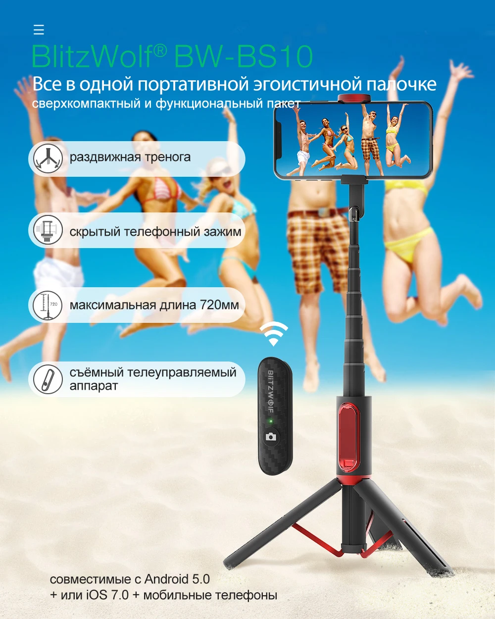 BlitzWolf All In One беспроводной штатив Selfie Stick Держатель телефона Bluetooth-совместимый Выдвижной монопод Selfie Stick для iphone для xiaomi портативный открытый траваль vedio фото штатив