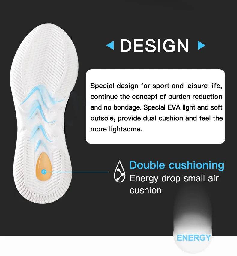 Повседневная обувь без шнуровкиСветильник Кая и мягкая подушка, легко снимаетсяДизайнСпециальная конструкция для спорта и досуга, продолжение концепции снижения нагрузки и отсутствие бондажа. Специальная легкая и мягкая подошва из ЭВА, обеспечивает Двойная подушка и более светильник ощущение. Маленькая воздушная подушка с двойной амортизацией Energy drop