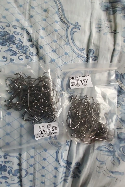 Доставка 50 дней. Острые только половина. Заточке поддаются хорошо. Для приманки 100мм в самый раз.