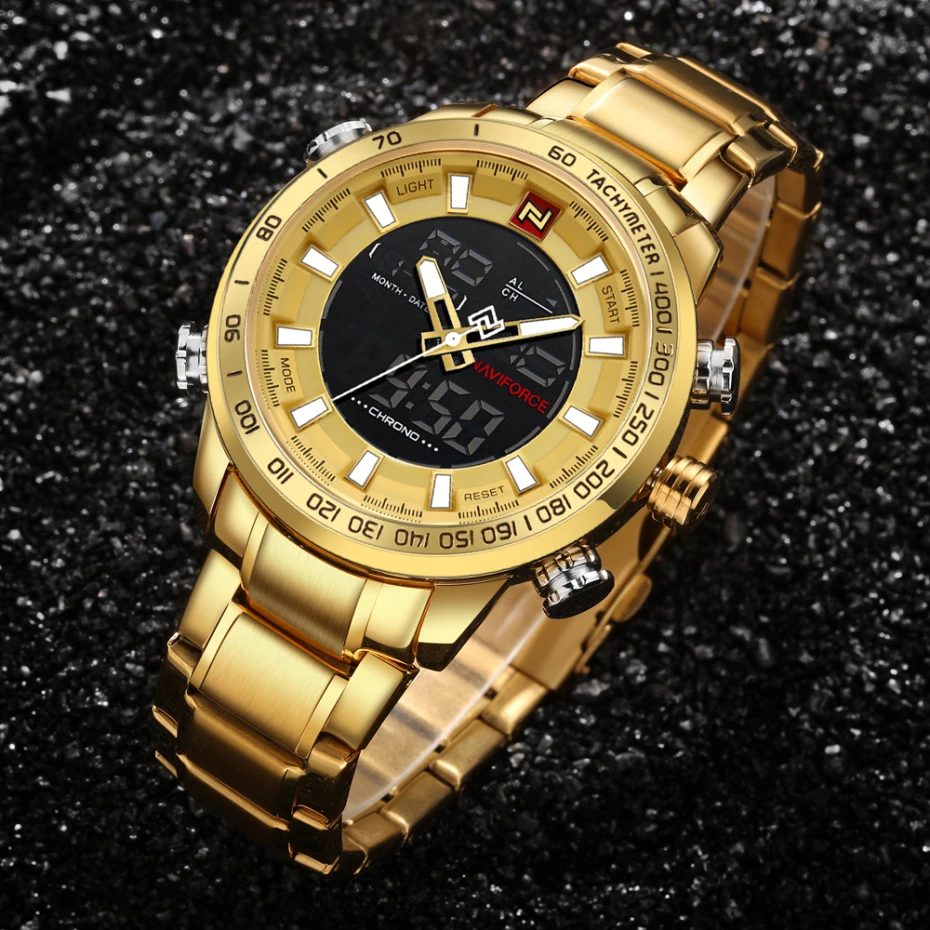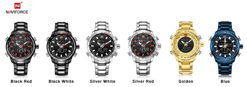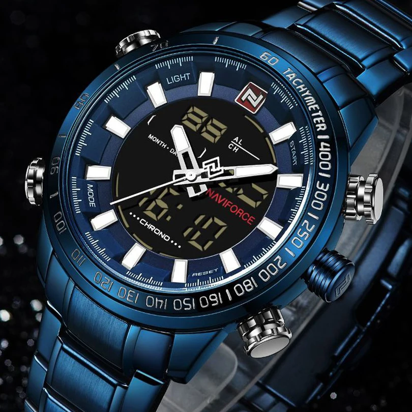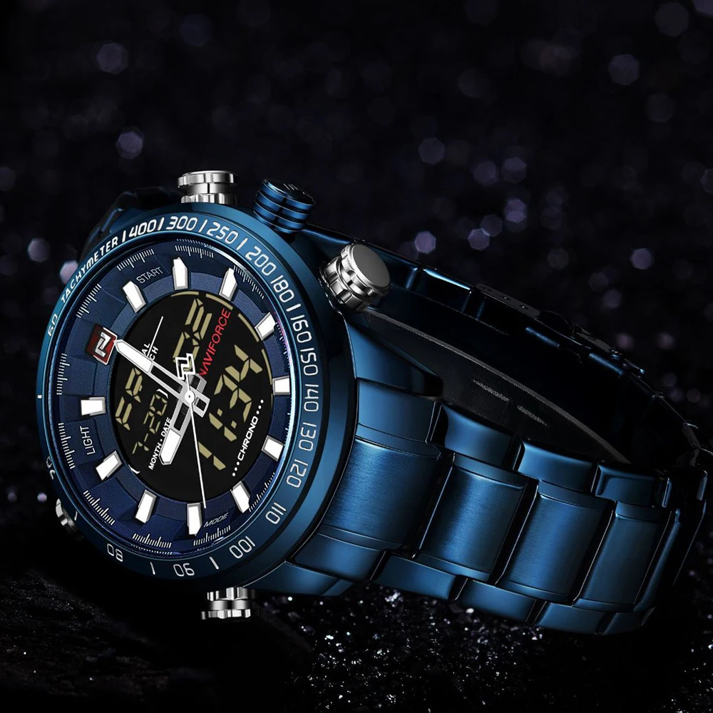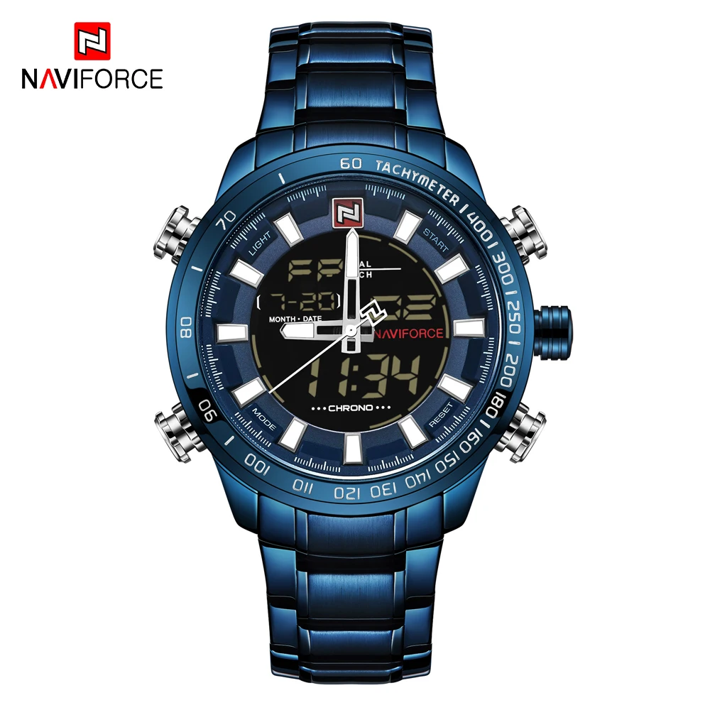 Часы NAVIFORCE мужские, полностью стальные, кварцевые, цифровые, водонепроницаемые, синие