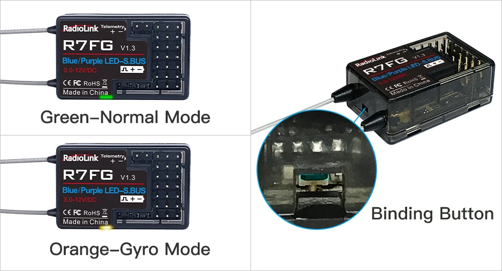 -PWM + PPM/PWM + SBUS (с гироскопом работы и один светодиодный статус красный) нажмите черную часть на кнопку привязки.