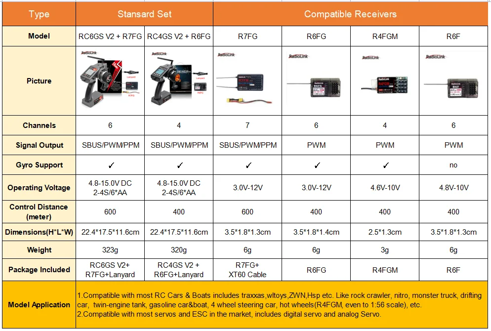 RC6GS V2Является идеальным партнером дляВсе типы RC автомобилей и лодокНа рынке, включая одномоторные и двухмоторные модели, такие как ползуны, танки, гусеницы, башмаки, Радиоуправляемый грузовик с коротким курсом, Радиоуправляемый гусеничный автомобиль, дрейфующий автомобиль с дистанционным управлением, бензиновый автомобиль с дистанционным управлением, мини RC автомобиль, RC монстр грузовик, внедорожник RC автомобиль и другие типы RC автомобилей или лодок.