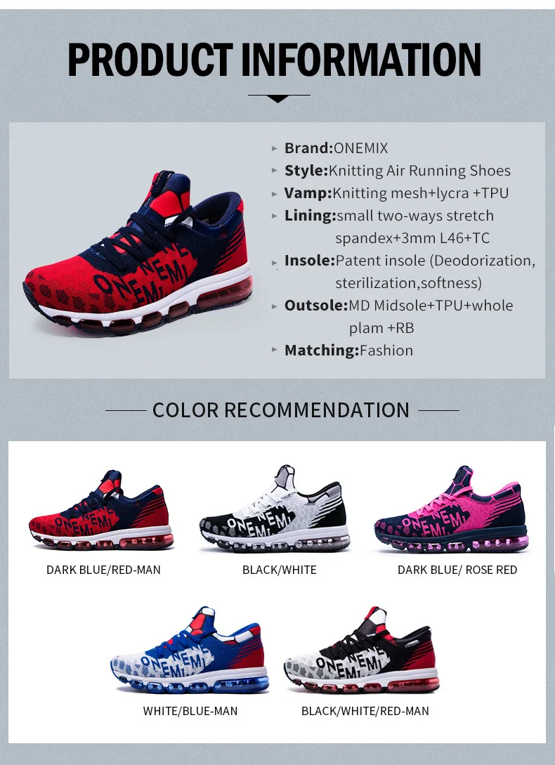 Ремешок: onemix Стиль: трикотажная обувь для бега Передняя часть: трикотажная сетка + лайкра + ТПУ Подкладка: Маленький Двусторонний эластичный спандекс + 3 мм l46 + TC Стелька: лакированная стелька (дезодорирование, стерилизация, мягкость) Подошва: средняя подошва MD + ТПУ + цельная платформа + RB Соответствие: Мода
