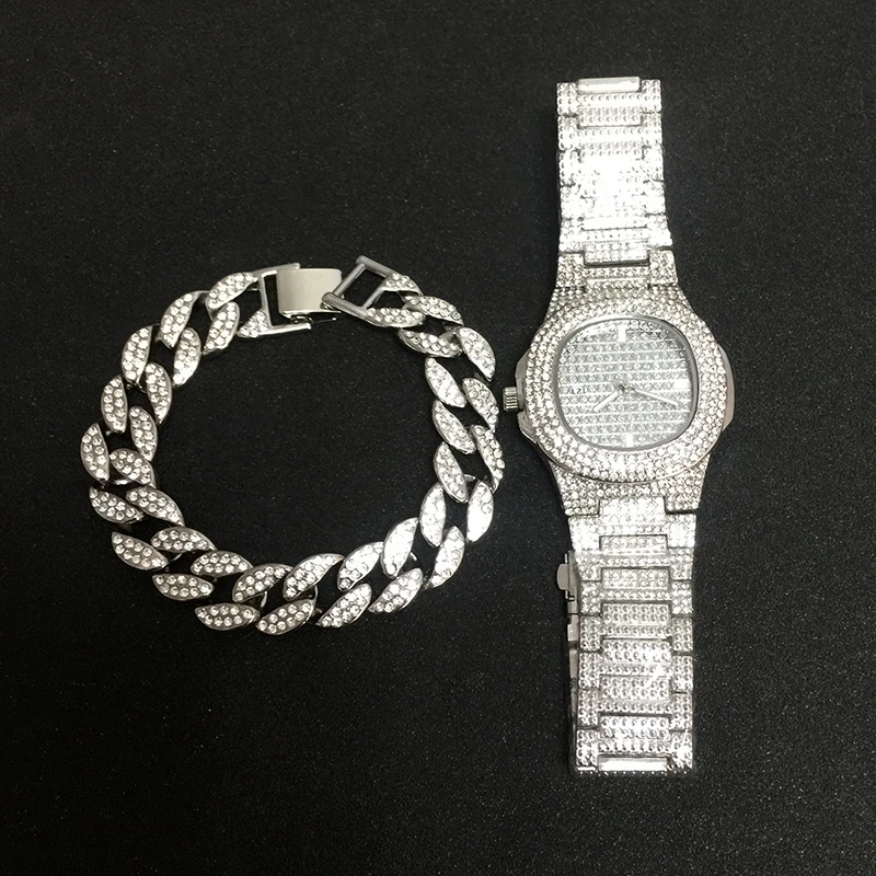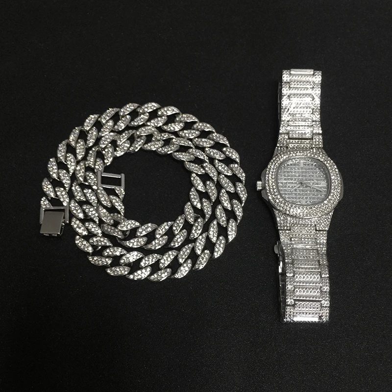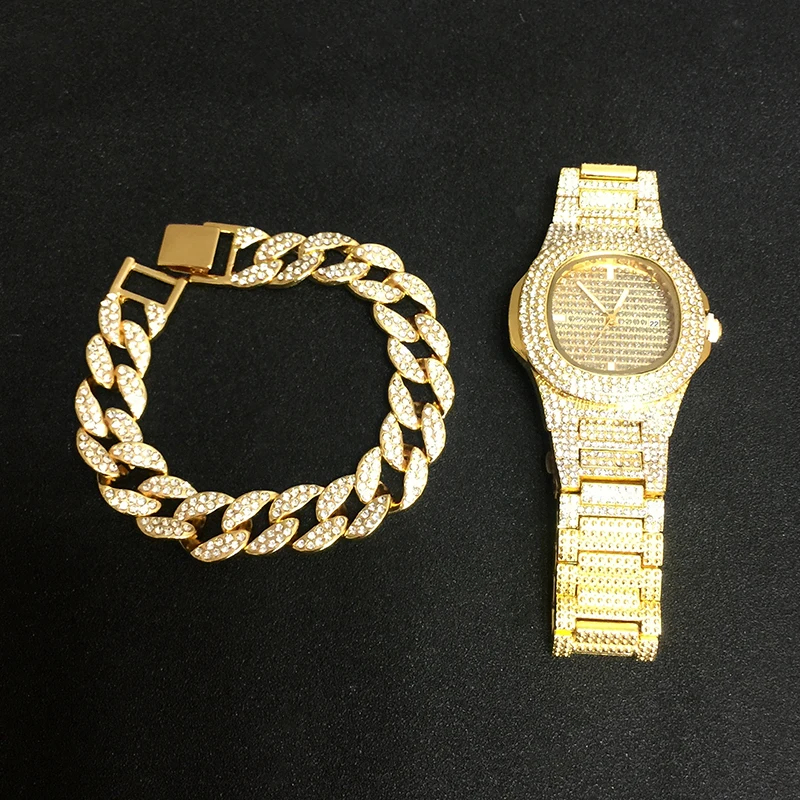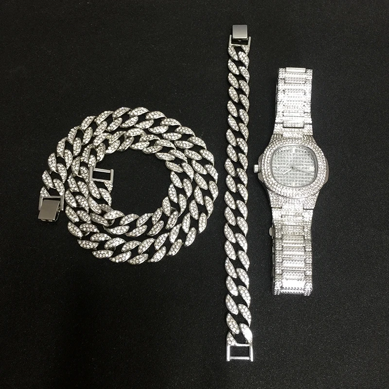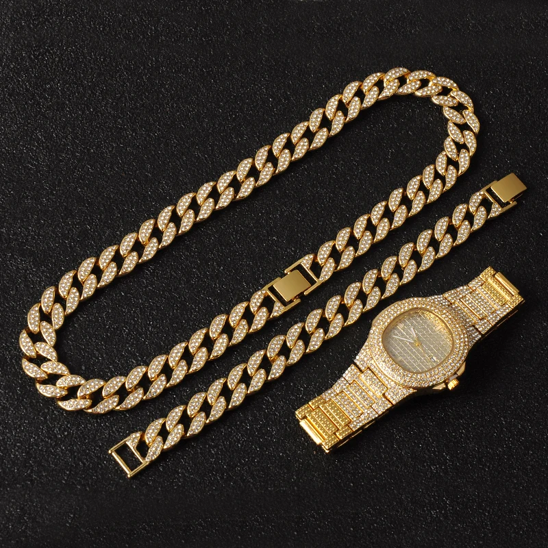 Золотое ожерелье + часы + браслет Хип-Хоп Майами, кубинская цепочка, украшенная камнями, стразы CZ Bling, рэпер для Мужчин, Ювелирные изделия