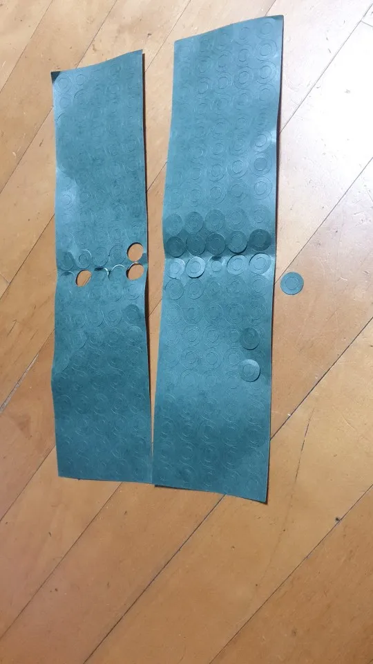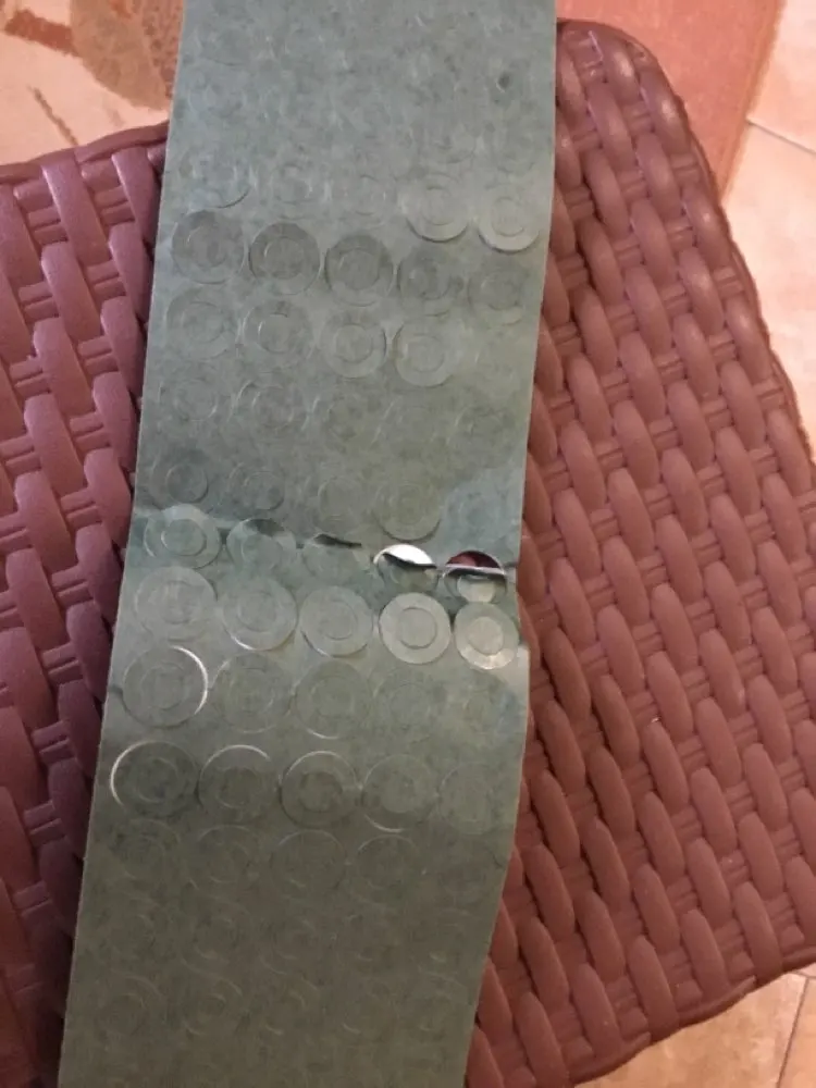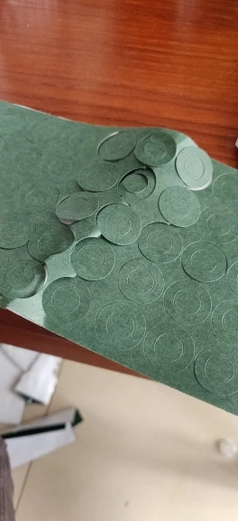 Изоляторы были посланы на одном листе 5 на 20 (100 шт.) без остатков основного листа. Из-за этого при упаковке около 25 прокладок приклеились друг к другу и к упаковке - потеряв часть клеевой основы. На фото уже разрезаный лист, видно что изоляторы топорщатся.