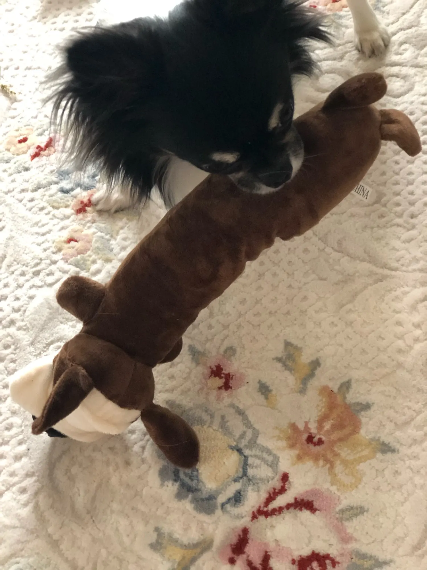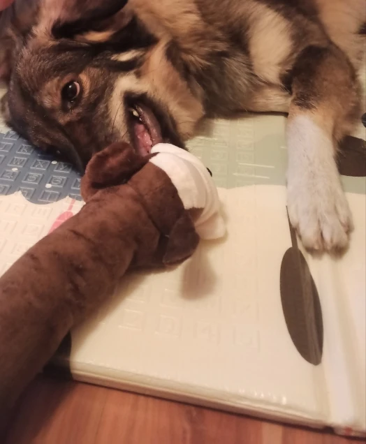 Моя собака корги разгрызла сразу же и стала вытаскивать и жевать наполнитель. Пришлось выбросить игрушку. С продавцом не общалась