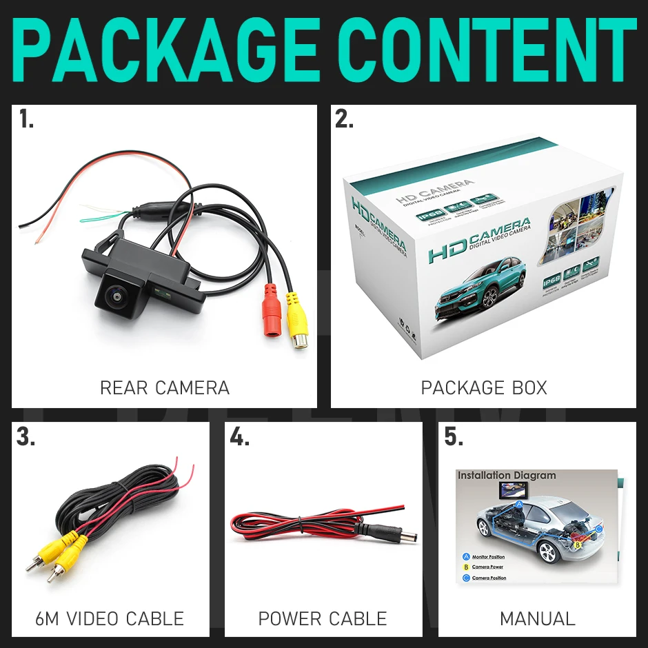 1. Задняя камера2. Коробка для посылка3. Видео кабель (6 м)4. Кабель питания5. Руководство пользователя