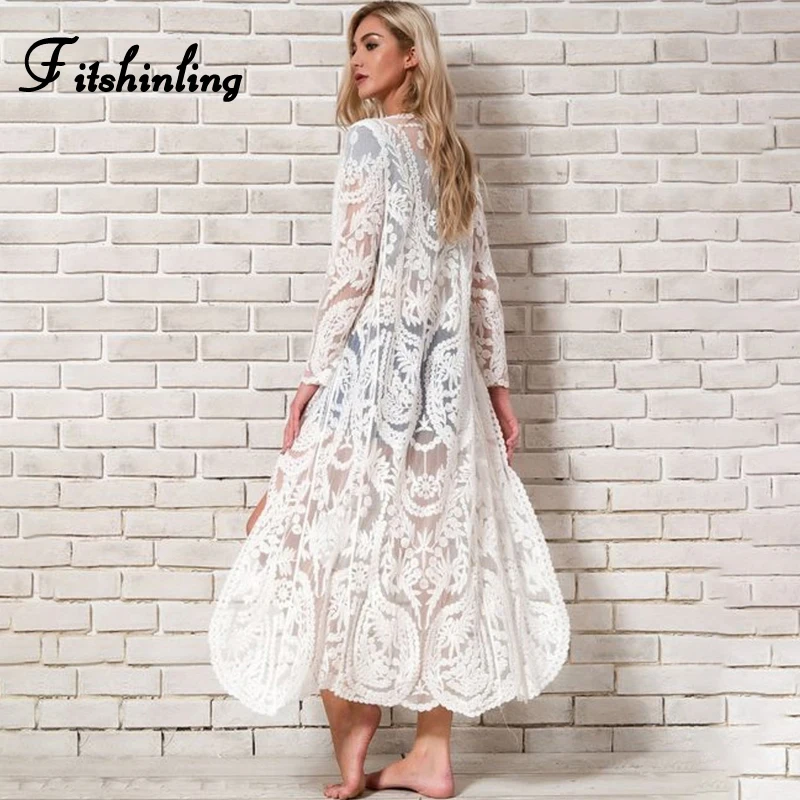 Fitshinling богемная белая Пляжная накидка с вышивкой женское кружевное кимоно сексуальный прозрачный длинный кардиган Saida de Praia