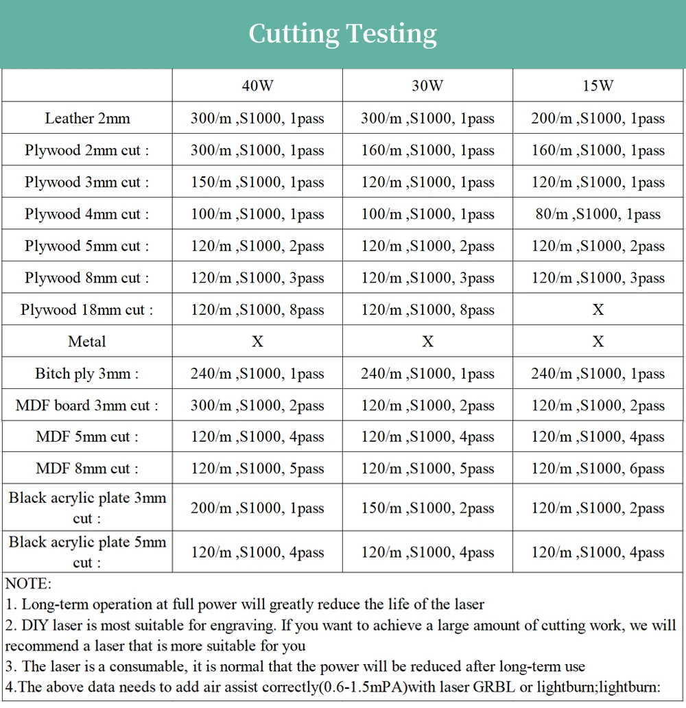 Товар соответствует описанию. Единственное, долго отправляли заказ. Отличный лазер, фанеру 4мм за 2 прохода при мощности 90%. В комплекте очки в чехле, провода под разные платы управления (3 вида), колонка для фокуса