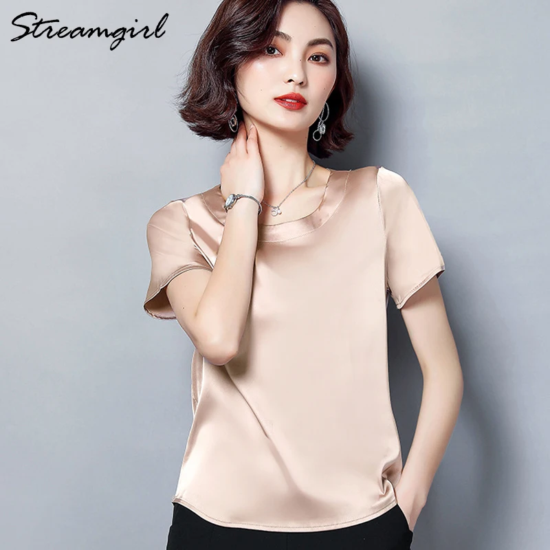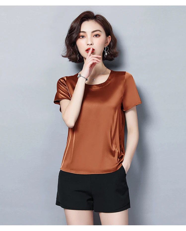 Женская атласная блузка с коротким рукавом, из искусственного шелка, лето, размера плюс