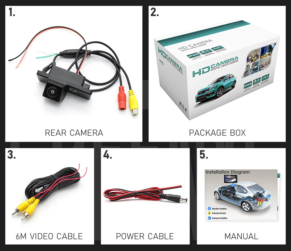 1. Задняя камера2. Коробка для посылка3. Видео кабель (6 м)4. Кабель питания5. Руководство пользователя