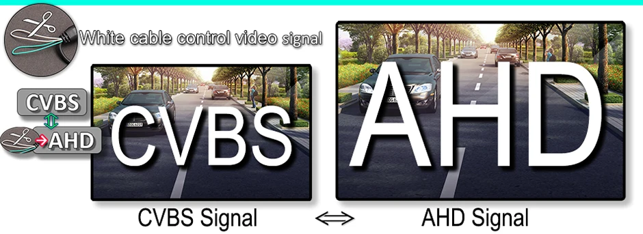 Через управление сигналом, он может поддерживать CVBS и AHD дисплеи.• D камера(CVBS )+( 1280x720 )+( 170 °)Обрежьте белый кабель →( AHD )+( 1280x720 )+( 170 °)• Камера E(AHD1080P )+( 1920x1080 )+( 175 °)Обрежьте белый кабель →( CVBS )+( 1280x720 )+( 125 °)