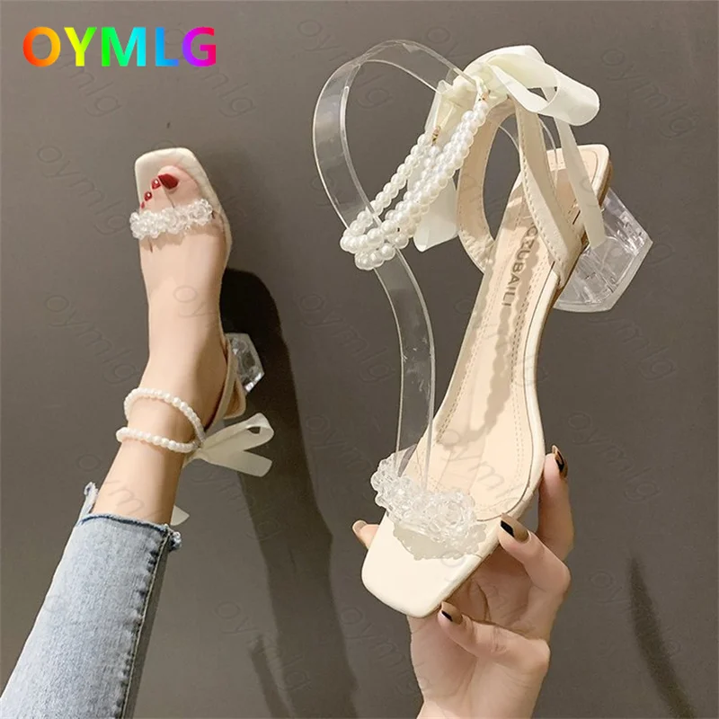 Модные шлепанцы на толстом каблуке; Коллекция 2021 года; Летние прозрачные женские туфли на высоком каблуке с жемчугом