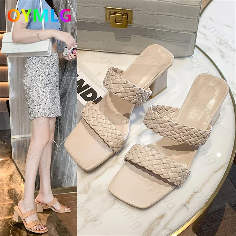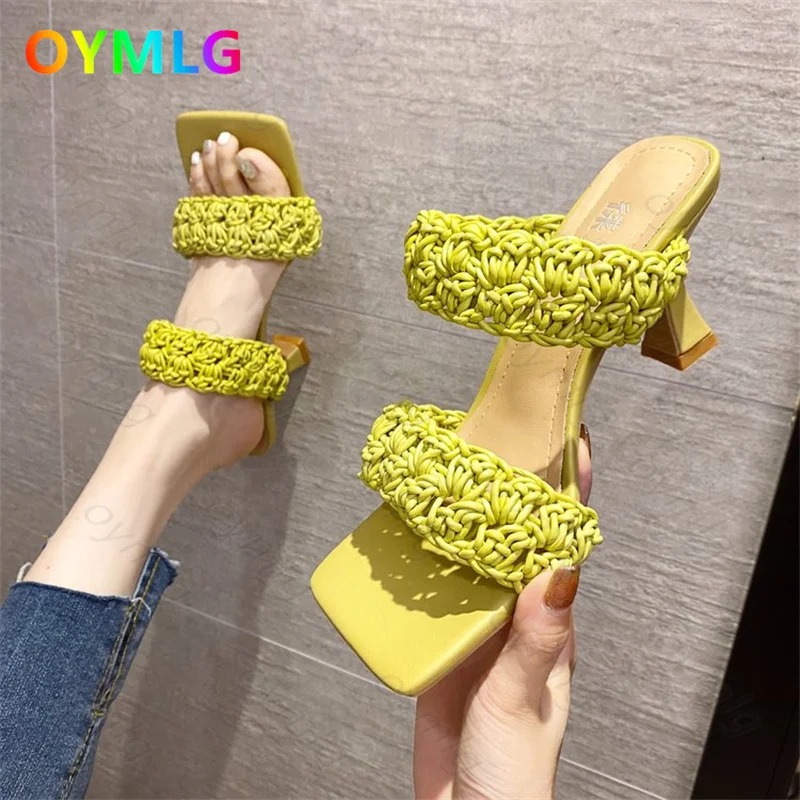 2021 г. Новая летняя верхняя одежда тканые босоножки на высоком толстом каблуке и шлепанцы женские модные красные Тапочки с квадратным носком