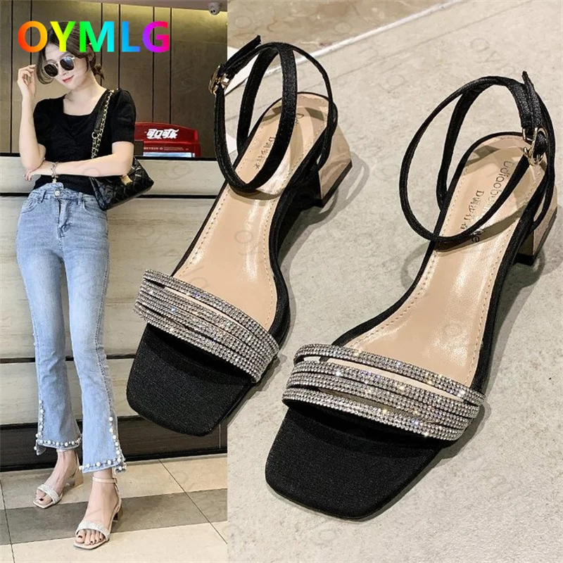 Одним словом, натуральная кожа, пряжки, стразы босоножки на толстом каблуке в стиле Феи 2021 летние, новые модели, низкий каблук, темперамент; Черная обувь на высоком каблуке