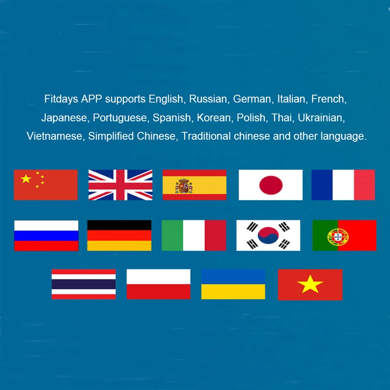 Приложение Fitdays поддерживает немецкий, итальянский, французский, японский, португальский, английский, испанский, корейский, тайский, украинский, вьетнамский, польский, упрощенный китайский, традиционный китайский и другие языки.