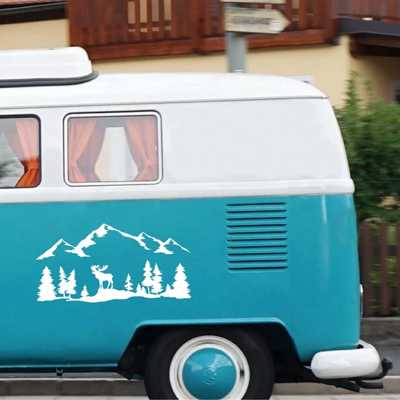 Виниловая художественная наклейка на внедорожник, RV, кемпер, внедорожник, лось, деревья, лес, горы, художественная наклейка, Декор автомобиля, уличные походные наклейки, украшение