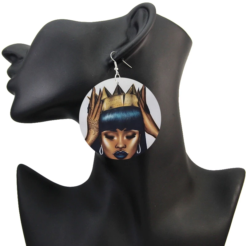 Серьги-подвески женские SOMESOOR, с обеих сторон, с рисунком Африканской королевы, деревянные, Корона из натуральных волос, черные, ювелирные украшения для подарка