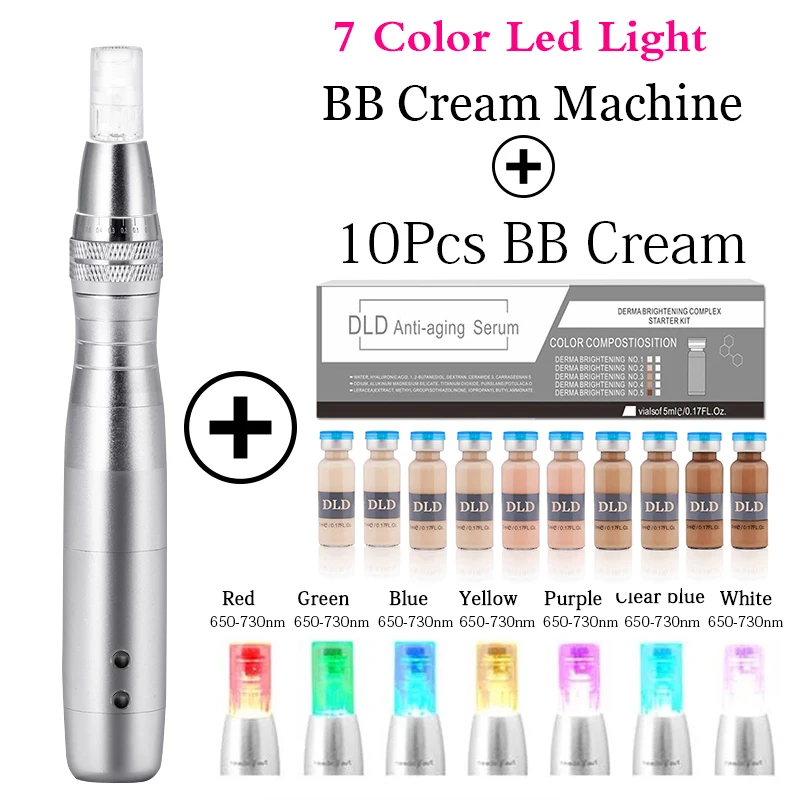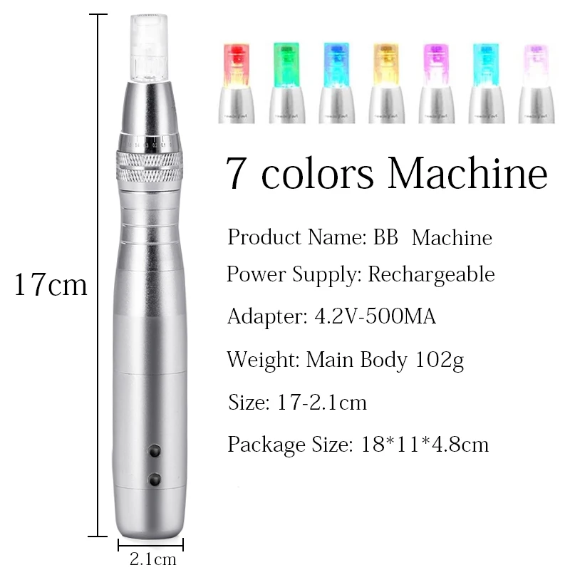 Что такое BB крем светящийся аппарат?Нано-Дерма ручка представляет собой портативный автоматический микро 7 цветов светодиодной подсветкой BB крем машины. Используйте для BB крема светящаяся сыворотка, это не хирургическое омоложение кожи лечение, которое широко используется для омоложения кожи, повышения упругости кожи, уменьшения морщин, Уменьшение шрамов акне, уменьшение растяжки, стимуляция роста волос, отбеливание и назначение активных ингредиентов. Этот прибор помогает косметике проникать и впитываться, стимулируя кожу.Не нужно покупать новый каждый раз. Просто замените иглу. Длина иглы регулируется от 0,25 мм до 2,5 мм. Удобнее обрабатывать узкие области, такие как нос, вокруг глаз или рта. Кроме того, скорость вибрации может контролироваться в 5 уровней.Что Дерма Пен может для вас сделать?1. Удаление морщин, удаление акне, улучшение шрамов, омоложение2. Узкая Фокусировка на месте (глабеллум, морщинка, шрам)3. Уменьшает поры4. Лечение стриатного гравидарума5. Улучшение морщин и тонких линий6. Лечение шрамов от акне и заживляющих ран7. Удаление волос8,7 цвет LED BB крем светящийся аппарат Фотон очень эффективен для видов ухода за кожей.Посылка включает в себя:-1x светодиодный светильник BB крем светящийся аппарат-1x руководство по эксплуатации на английском языке-1x штепсельная вилка-1x коробка-2x иглыПараметры:Батарея: литиевая батарея (7,4 В, 400 мАч)Интерфейс: спиральМатериал корпуса: алюминийВходное напряжение: 100-240 ВВыходное напряжение: 5 В пост, 1000MAАдаптер: доступны США/ЕСЧастота вибрации: 6500-10000r/мУровни скорости: 1-5 уровнейДлина иглы: от 0,25 мм до 2,0 мм РегулируемаяИгольчатый картридж: 9,12,24,36,42, Круглый нано, 2D,3D,5DМатериал иглы: нержавеющая сталь и ТитанЦвет светодиода: красный, синий, зеленый, желтый, фиолетовый, прозрачный синий, лазерный белыйКак использовать BB крем светящийся аппарат?Различная длина иглы принимает другой метод использованияРазмер 0-0,50 мм метод использования: в коже на круге обработки.Размер 1,00-2,50 мм способ использования: нравится штемпельный ролик с помощью способа (штамп на коже)