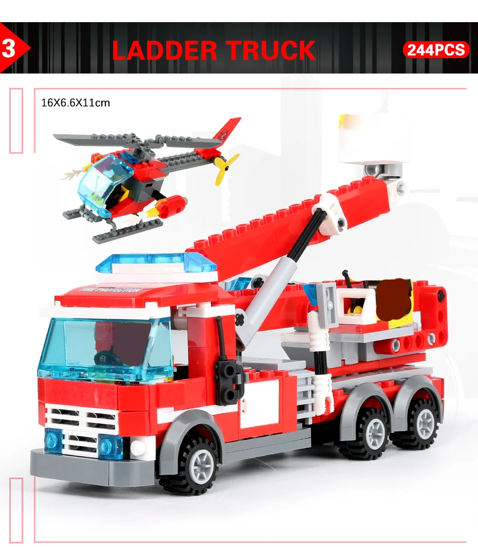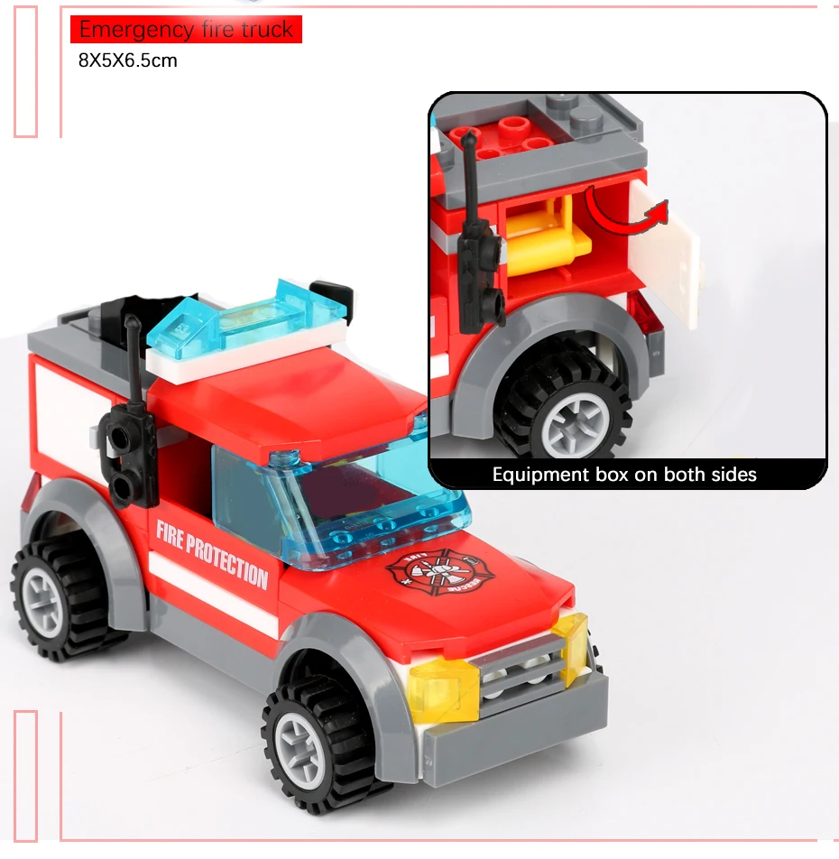 I have just received (ordered 5 Dec. 2020; received 9/2/2021) the parcel which contained numerous bricks. The quality is very good! The bricks are organised in small bags as well as there are some brochures/guidelines to assemble the cars/fire station. The bricks are compatible with the original firm/brand. I have not checked the total number of the bricks.. Hope not to miss anyone.. The seller is good in communication! The seller shipped the parcel quickly but the delay (2 months) of delivery was due to Black Friday and Holidays load of the Post Office/Courier service.