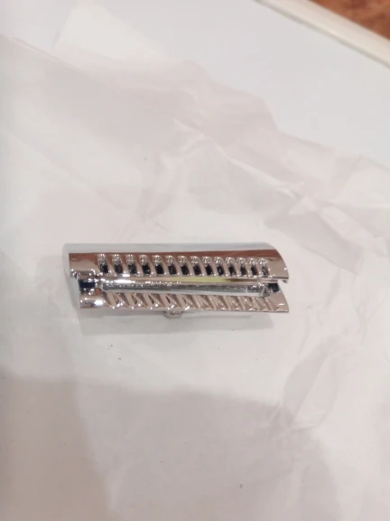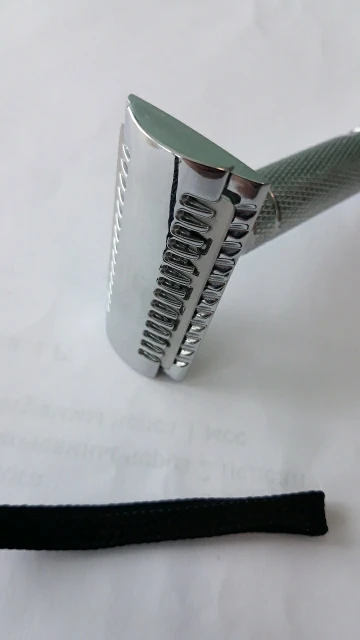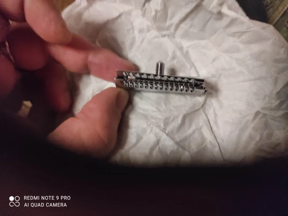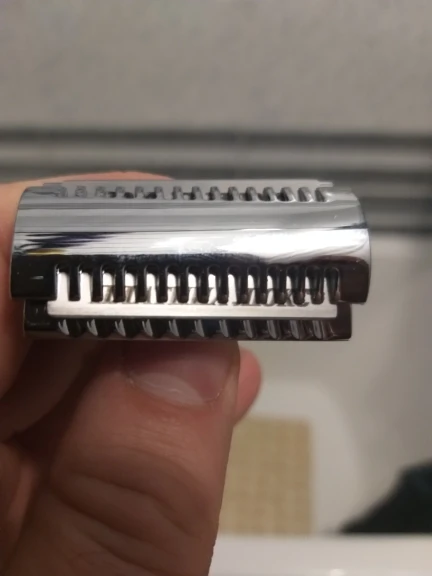 На первый взгляд не понравилась. Блестит, как надо, но люфт между двумя половинками слишком большой. Само лезвие на штырьках тоже люфтит больше чем на Muhle. Получается, что при сборке надо следить чтобы лезвие стояло параллельно. Это я ещё лезвие хорошее примерял. Я замечал что другие лезвия на Muhle вставали с бо́льшим люфтом чем Feather, и всегда их ровнял в бритве. На этой голове этот эффект будет проявляться более ярко. Но, практика покажет, на сколько это важно или нет.