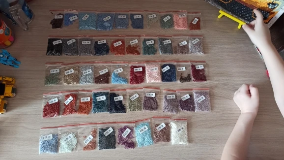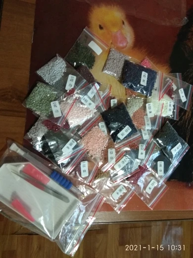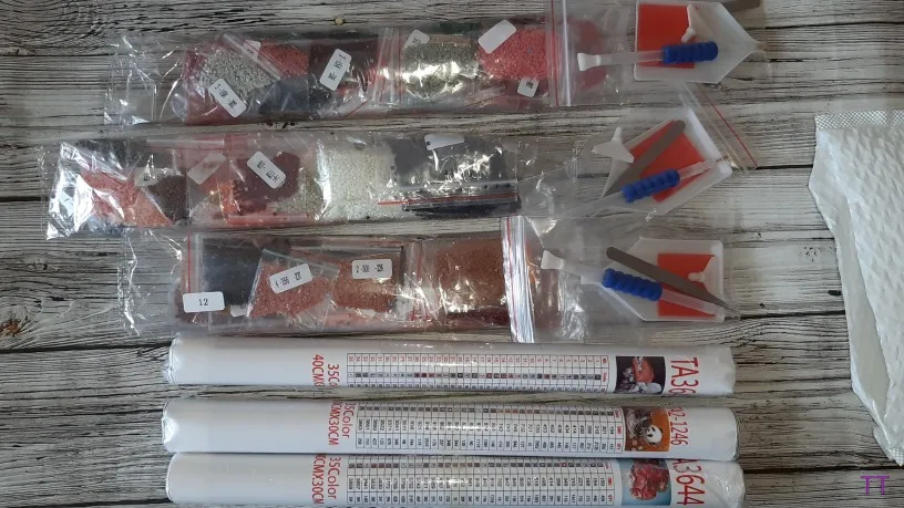 Посылка долетела за 3 недели. Трек отслеживался. По цветам - полный комплект номеров. Удобно, что камни в отдельных zip.пакетах. На данный момент выкладываю картину, каждый камень доставляет удовольствие. По разработке схемы: как и везде в перенаборе, есть погрешность, но на своё усмотрение заменяю цвета. Готовую работу размещу по готовности.