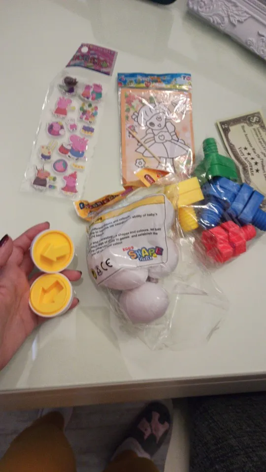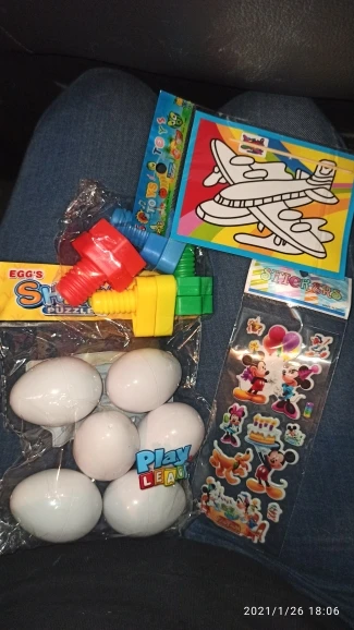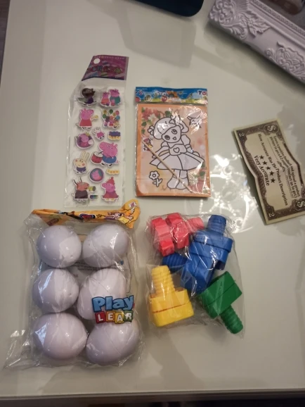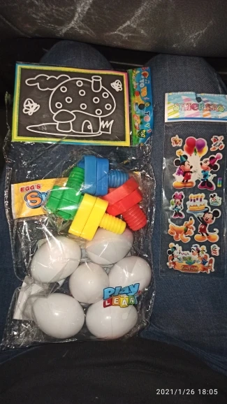Как на фотографии. Винты отличные, один должен предоставить еще один Пекин, но я думаю, что с несколько раз использования он будет оставаться таким же, как и другие. Яйца также очень хорошие, хотя они несколько более сложны, чтобы открыть для ребенка, потому что это требует больше силы, может быть, они должны прийти немного свободнее. Стикер и классные наклейки, я буду великолепен. Я рекомендую. Мне не нужно было обращаться к продавцу.