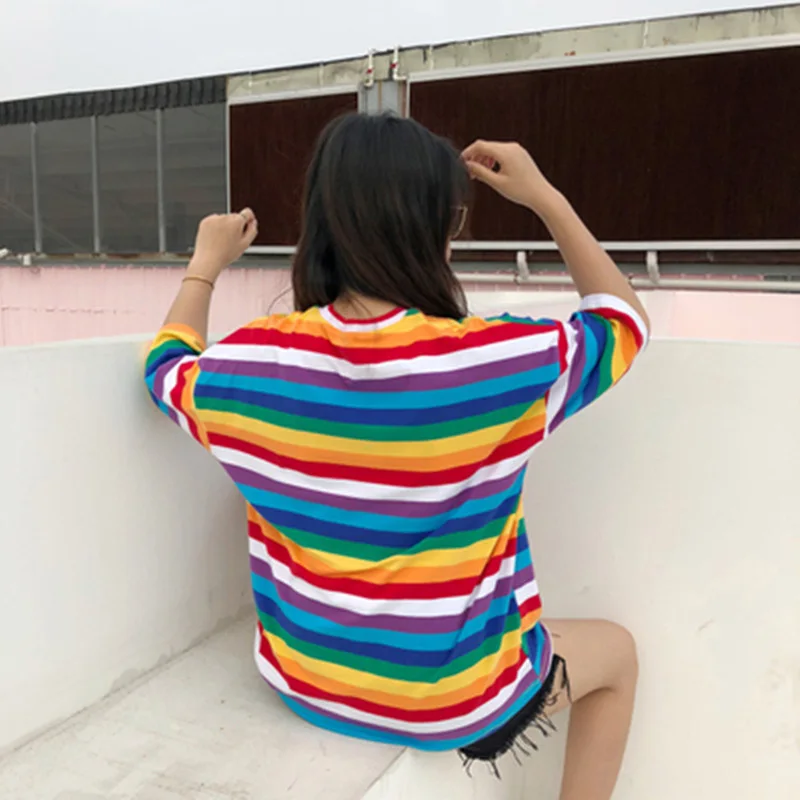 Женская футболка в радужную полоску, летняя футболка с коротким рукавом в Корейском стиле панк, camiseta feminina, 2019