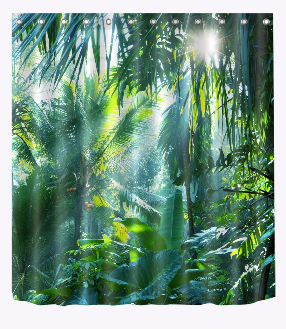 Занавеска для душа с зелеными банановыми листьями, водонепроницаемая моющаяся штора из полиэстера для ванной комнаты, декор в виде тропических джунглей, растений