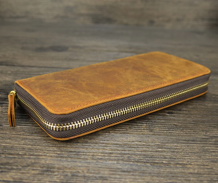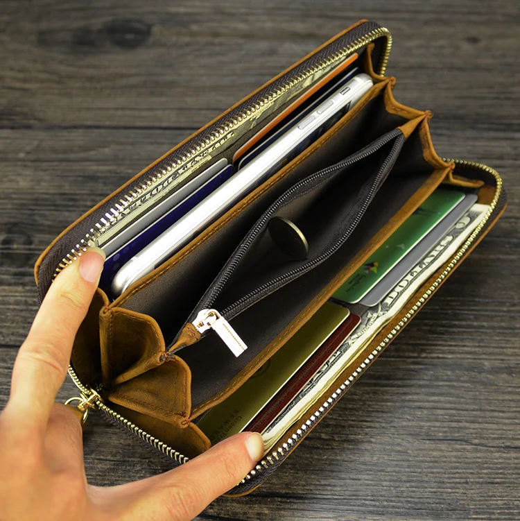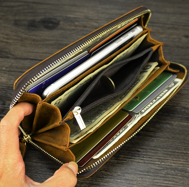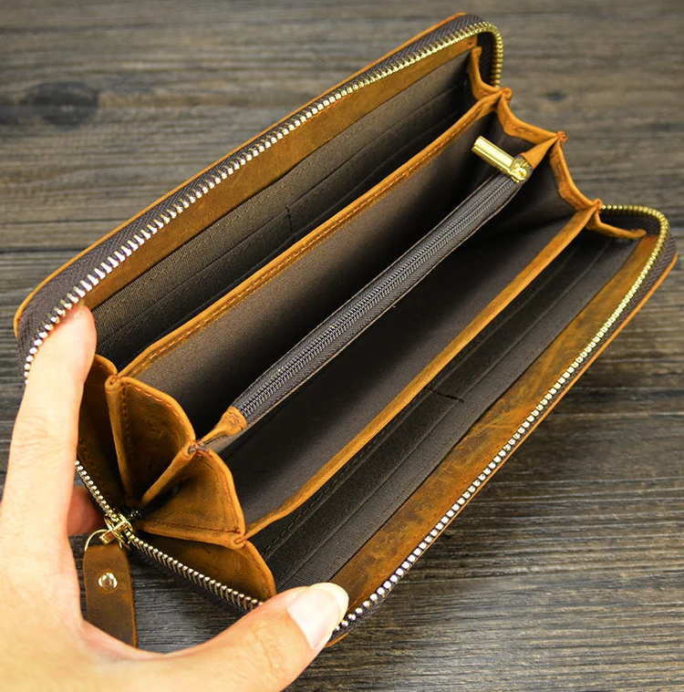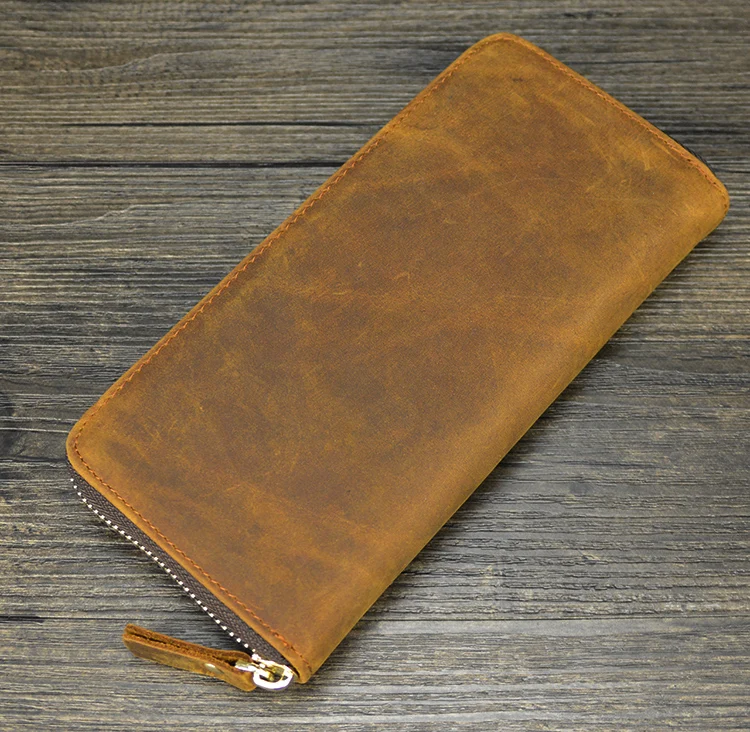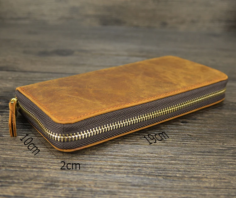 Винтажный Длинный кожаный кошелек Crazy Horse для мужчин и женщин, длинный бумажник на одной молнии для сотового телефона, карт, мелочи, наличные, с двойным прослойным слоем
