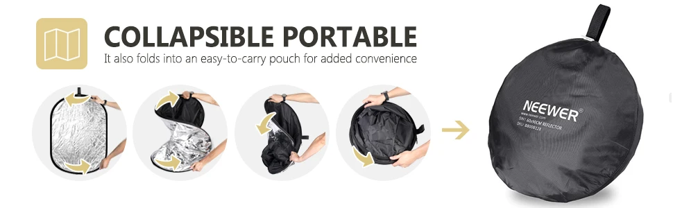 Этот складной отражатель 5 в 1 поставляется с полупрозрачными, серебристыми, золотыми, белыми и черными пятью наиболее популярными поверхностями. Упаковывается в пакет на молнии. Складывается в карман для переноски, надежная и гибкая стальная пружинная рама обеспечивает легкое нанесение и закрытие.