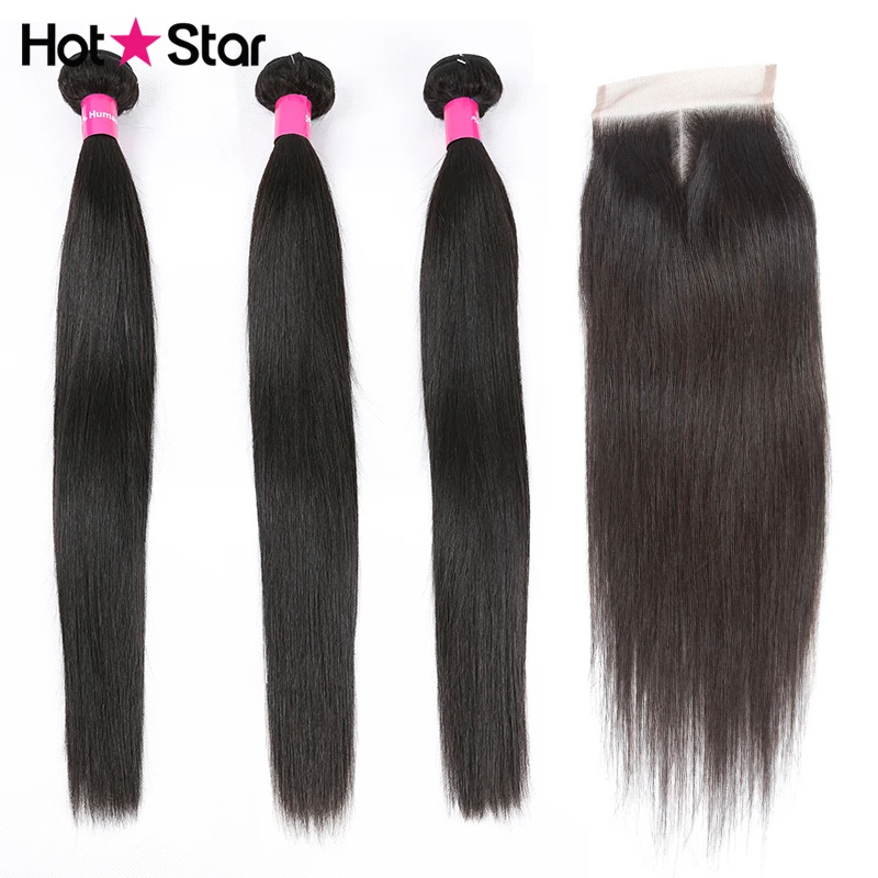 Горячая звезда прямые пряди с закрытием Remy человеческие пряди закрытием бразильские волосы плетение 3 пряди закрытие