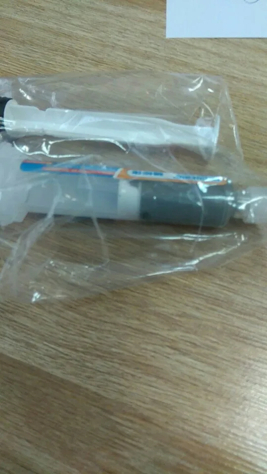 Пришло в красивом блестящем пакете из пупырки. С пастой еще не работал, но выглядит круто, шприц тяжеленький, масса в нем однородна без пустот, в комплекте давилка и игла-сопло. Если что не так - допишу.