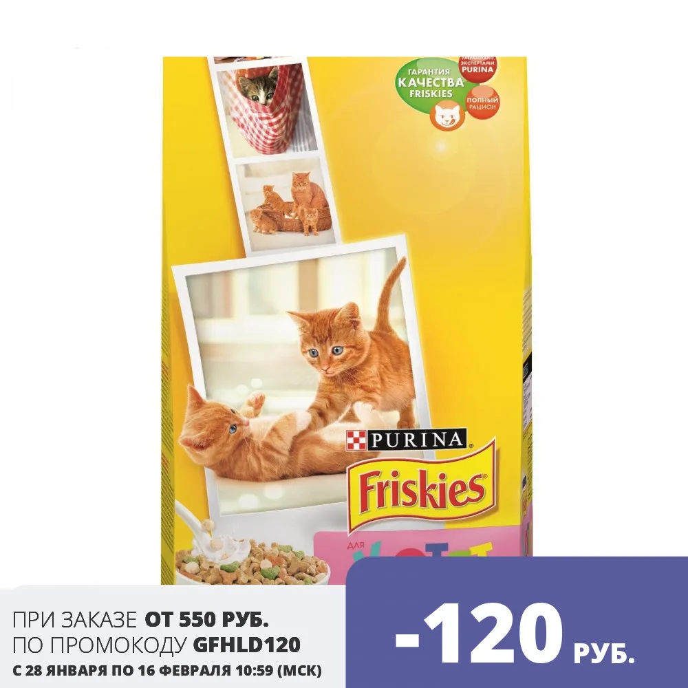 Friskies® для котят - это полнорационное сбалансированное питание, специально разработанное для здорового развития Вашего котенка. Благодаря содержанию курицы, овощей, молока и минеральных веществ и витаминов, корм Friskies® обеспечивает правильный переход от материнского молока к твердой пище. Рекомендации по кормлению: Положите сразу всю дневную норму сухого корма Friskies® в миску. Ваша кошка сама решит, когда и сколько она будет есть. Обычно кошки едят несколько раз в день. Следите за тем, чтобы у Вашей кошки всегда была свежая чистая питьевая вода. Достаточное потребление воды – обязательное условие правильного ежедневного питания кошки. Если раньше Вы не использовали сухой корм Friskies®, пожалуйста, следуйте рекомендациям: Переходите на корм Friskies® плавно, в течение 7 дней. Состав: злаки, мясо и продукты его переработки (в том числе курица), растительный белок, продукты переработки овощей, жиры и масла, дрожжи, консерванты, рыбу и продукты ее переработки (в том числе тунец), минеральные вещества, витамины, овощи (сушеный зеленый горох), молоко и продукты его переработки (обезжиренное сухое молоко), красители и антиоксиданты. Страна производства: Россия Условия хранения: В сухом прохладном месте