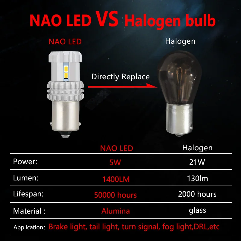 Цвет: белый/янтарный/красныйСветодиод NAO на 300% ярче, чем оригинальная галогенная лампаСветодиод NAO на 150% ярче других ламп