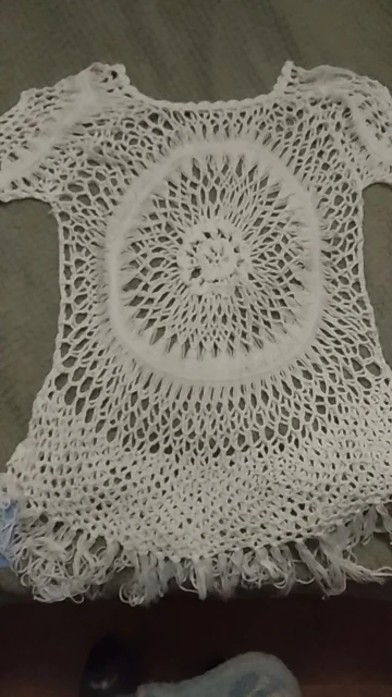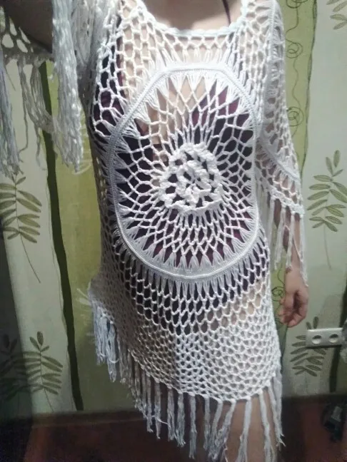 Очень красивая туника. Приятная ткань. Я взяла белую тунику с солнцем и кистями.она мне до колен при росте 158см.Продавец хорошо упаковал и быстро доставил(в течении 2 недель)