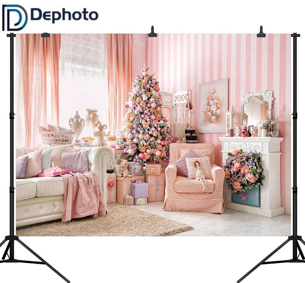 Фоны для фотосъемки с изображением камина, дивана, розовой рождественской елки