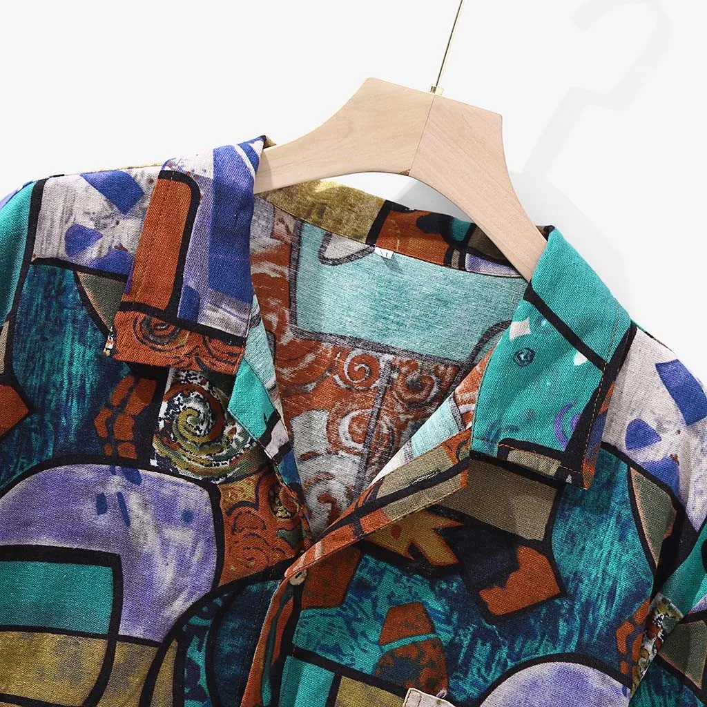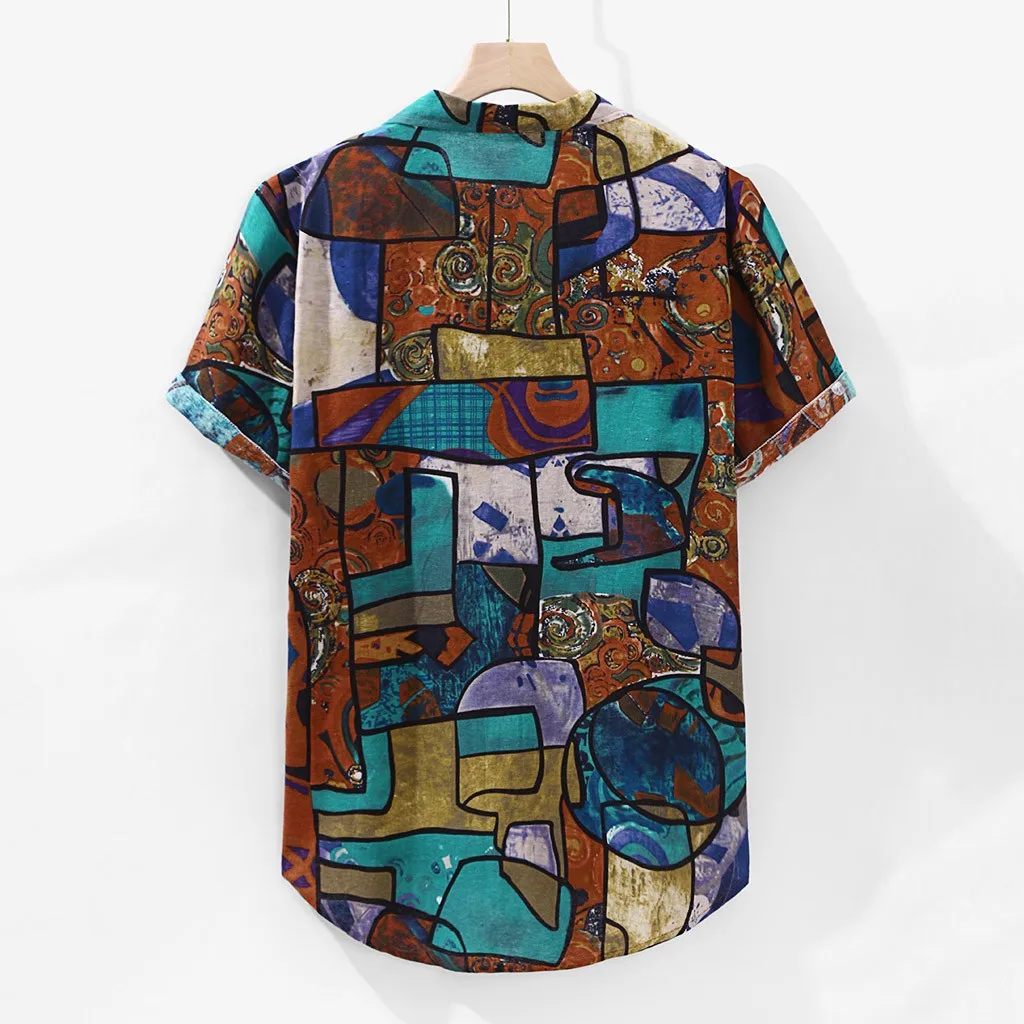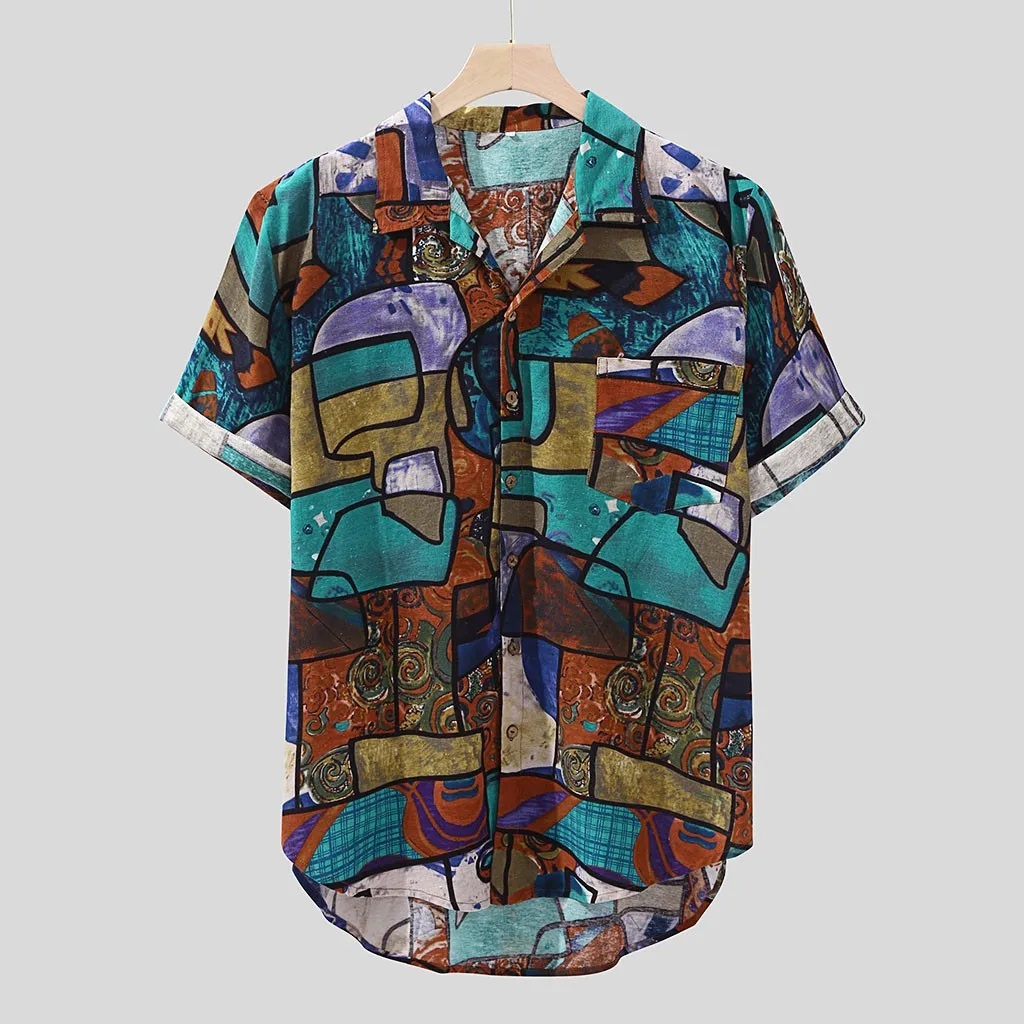 Мужская Гавайская Свободная рубашка с короткими рукавами и круглым подолом, льняная блузка с принтом