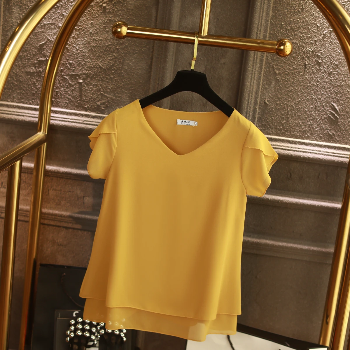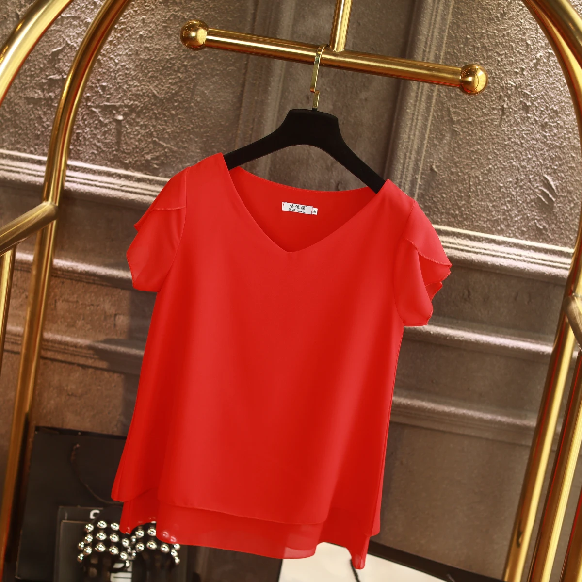 Женская шифоновая рубашка с коротким рукавом, Повседневная однотонная Свободная блузка с v-образным вырезом, 9 цветов, лето 2019