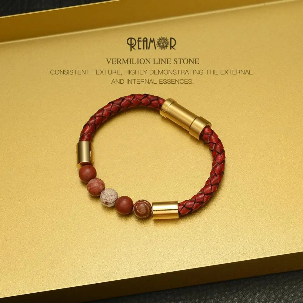 Имя:REAMOR восходящее солнце серии красный браслет из натурального камня золото нержавеющая сталь Встроенная застежка воловья кожа плетеные браслеты