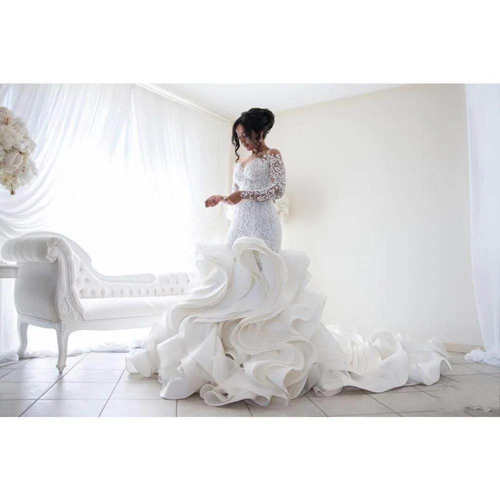 Кружевное Свадебное платье русалки из Саудовской Аравии с длинными рукавами, свадебные платья с королевским шлейфом и пуговицами, вечернее платье с оборками, 2019