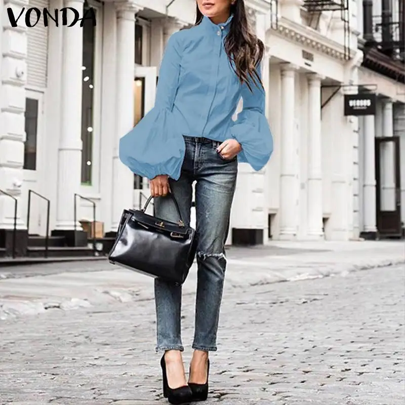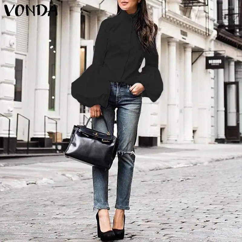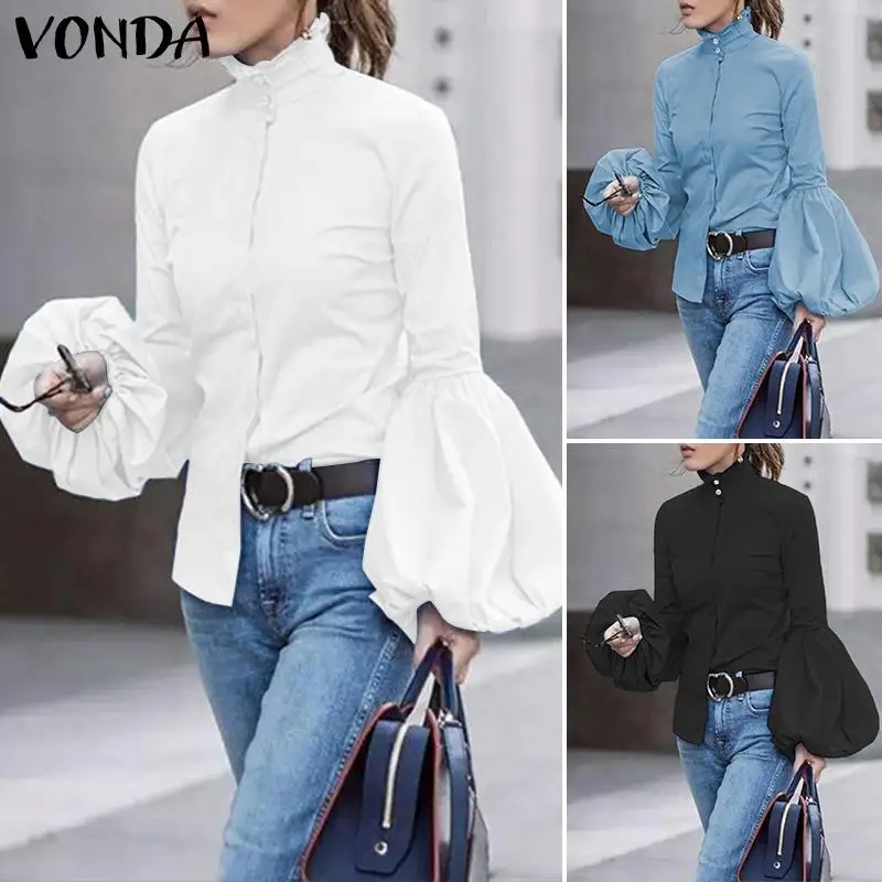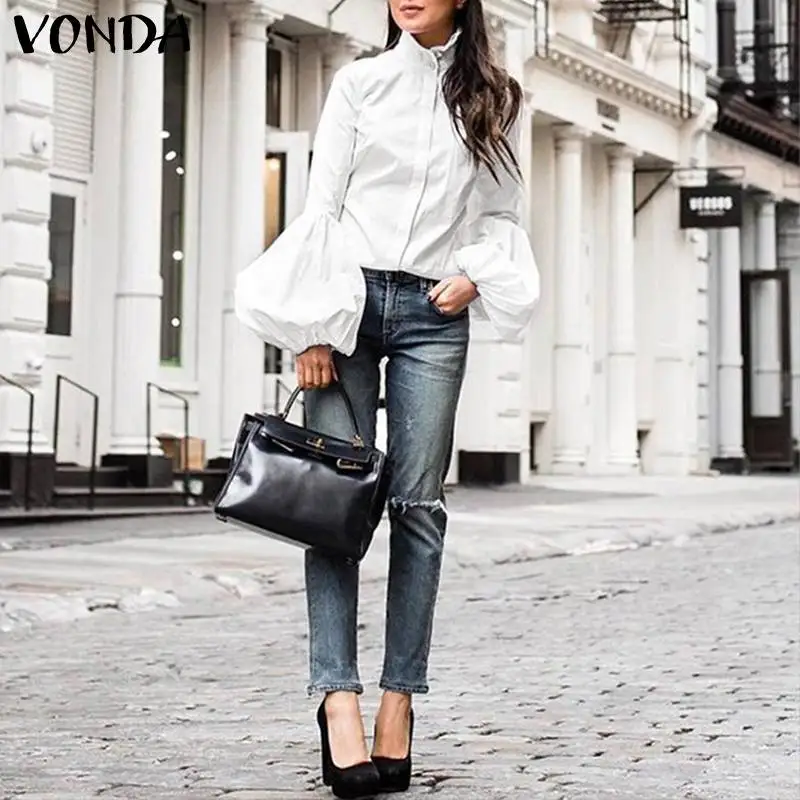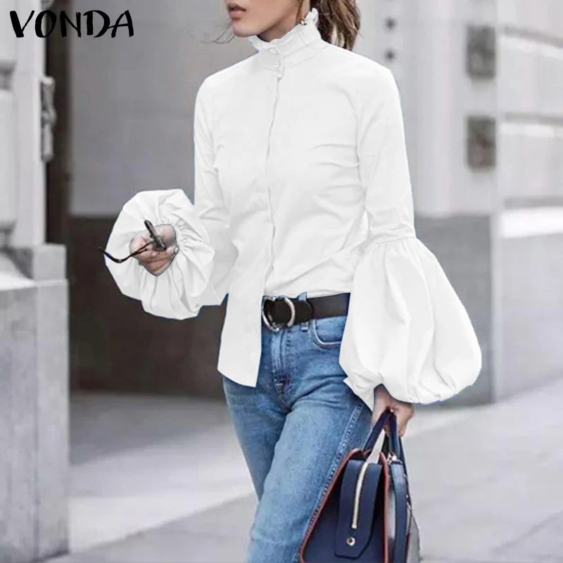 Женская блузка VONDA 2021, модные женские однотонные Топы с длинным рукавом-фонариком, повседневные блузы, верхняя одежда, топ, Белая Туника оверсайз