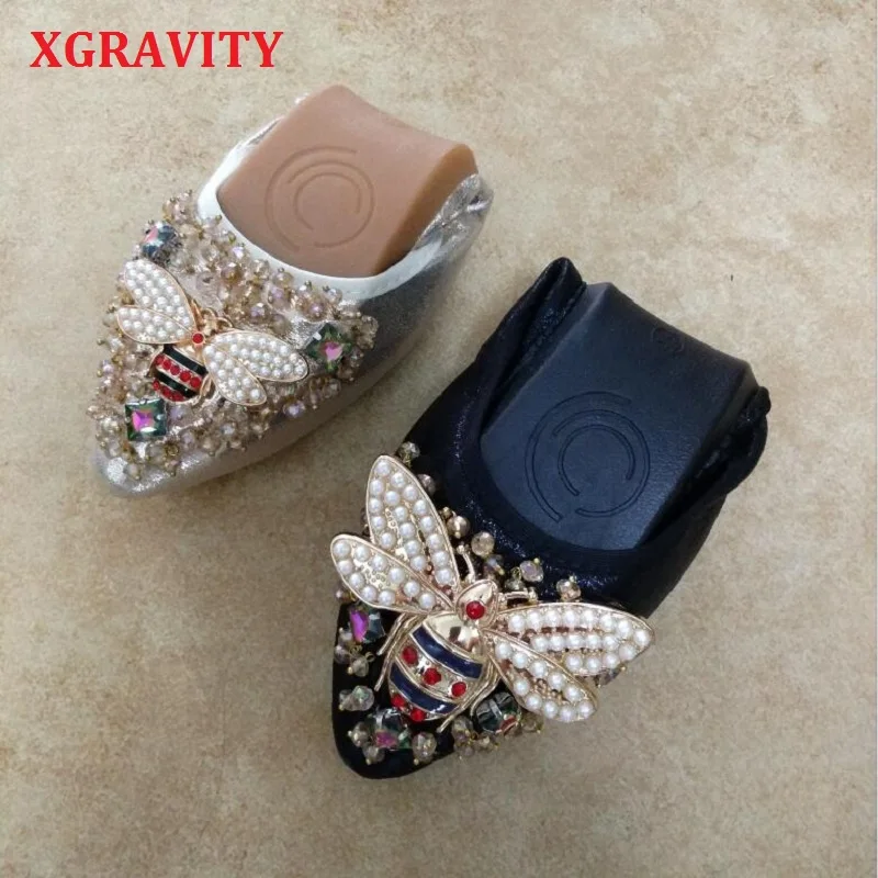 XGRAVITY пчелиный дизайнерская обувь с украшением в виде кристаллов женские Большой размер, туфли на плоской подошве; Элегантная и удобная женская обувь модные стразы женская мягкая обувь для женщин и девушек; A031