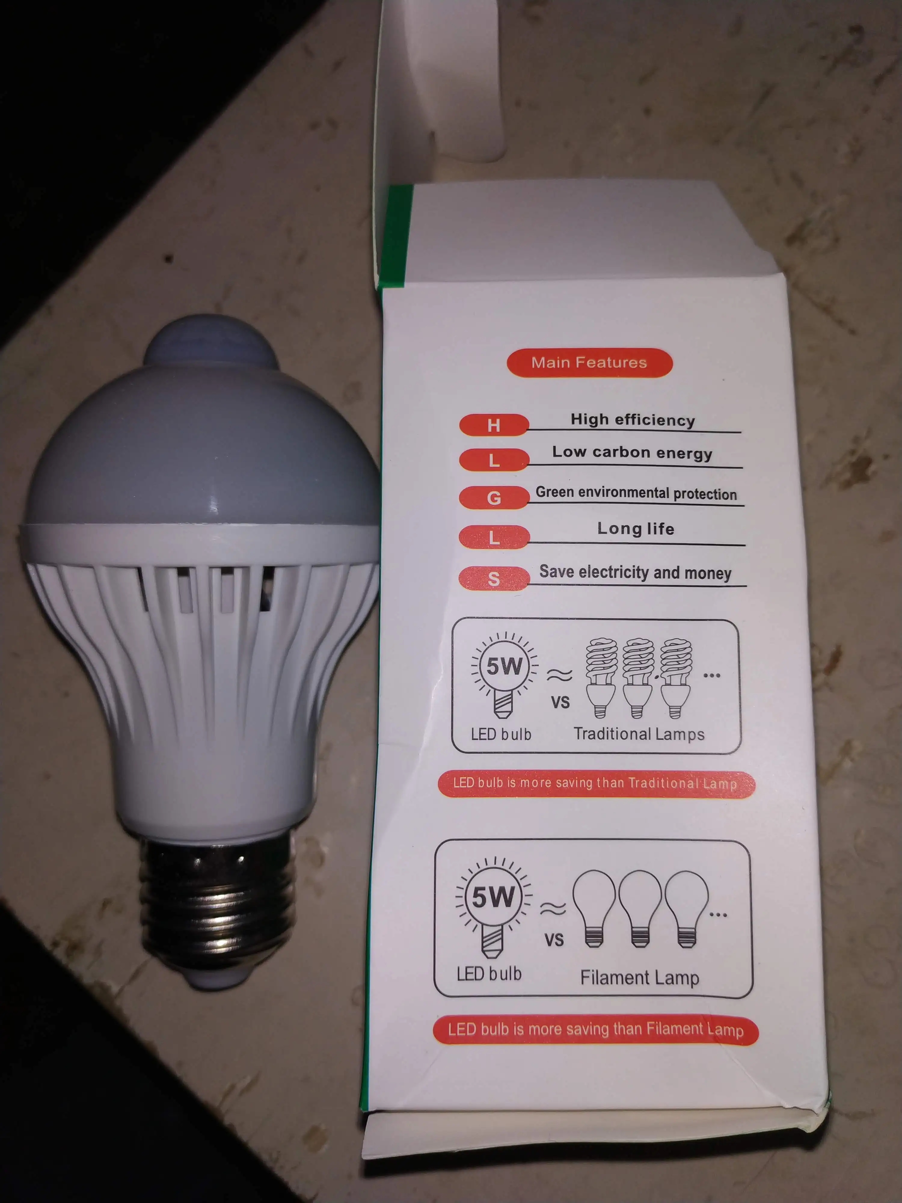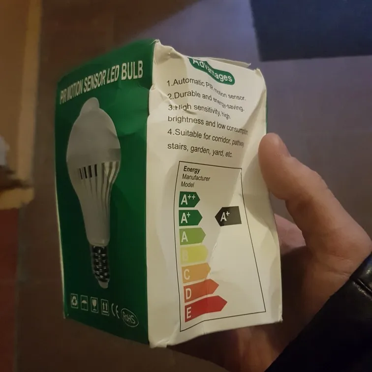 коробка в принципе как у всех мятая но лампочка целая работает. реагирует на любой звук горит в течении 30 секунд.